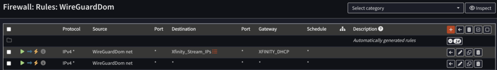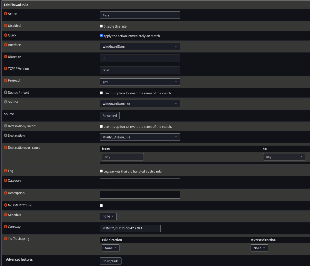 So far everything is great. Other clients on the network get the same fast access and the Apple TV gets all of its Xfinity traffic sent over the WireGuard tunnel to the Xfinity gateway at home. I’ll likely look at locking the OPNsense down further, but I may just leave that so I can send other clients over the tunnel as needed.
