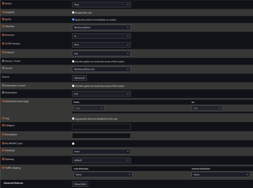 I’m not sure why, but the official docs didn’t work for me, but I followed Dustin’s great post to get the WireGuard server set up on OPNsense. I set up the server to route all traffic over the tunnel by default instead of his instructions in the “Add Firewall Rules to Access Internal Network(s)/Internet” section like this: