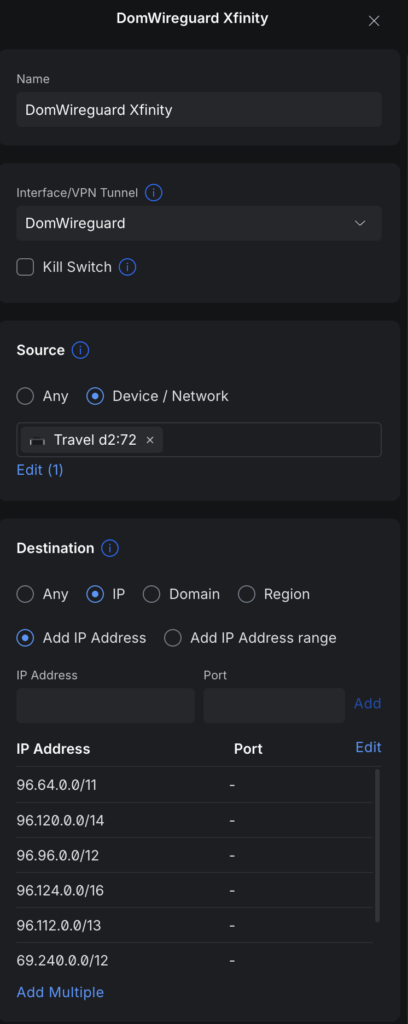 Don’t forget to use that “Add Multiple” button at the bottom! With that you can copy and paste right out of the OPNsense alias into the UniFi policy. Also disable the “Kill Switch” unless you feel you want that.